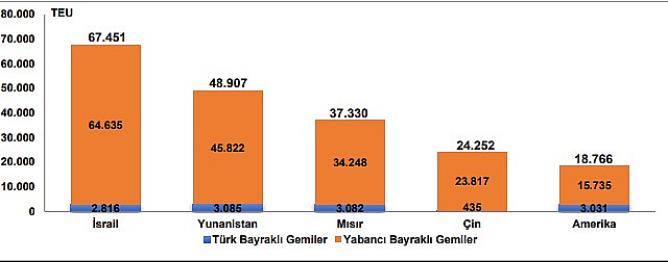 2022 yılı Ağustos ayında limanlarımızda denizyolu ile yapılan en fazla ithalat amaçlı konteyner boşaltmasını 67 bin 451 TEU ile İsrail’den gelen konteynerler oluşturdu. Bu yüklerin yüzde 95,8’i (64 bin 635 TEU’su) yabancı bayraklı gemilerle taşındı. İsrail’i sırasıyla, 48 bin 907 TEU ile Yunanistan’dan ve 37 bin 330 TEU ile Mısır’dan gelen konteyner taşımaları takip etti.
