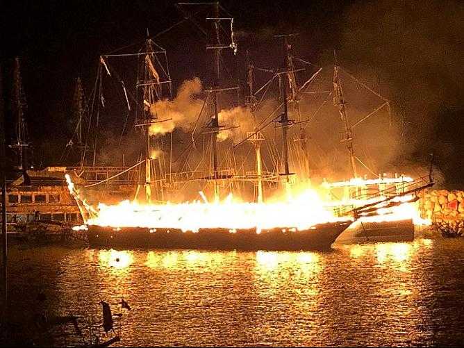 Olay, Türkler Mahallesi'nde saat 23:30 sıralarında yaşandı. Balıkçı barınağında demirli halde bulunan Mehmet Erdoğan, Mustafa Ünal, Hasan Çavuşoğlu ve Menderes Akdemir'e ait teknelerden Mustafa Ünal'a ait Mozi 07 isimli teknede henüz sebebi belirlenemeyen bir yangın çıktı. Yangının başladığı teknenin diğer teknelere zarar vermemesi için ipi kesilerek liman içine sürüklenmeye çalışıldığı sırada diğer üç tekneye temas etmesi sonucu tekneler alev aldı. İhbar üzerine olay yerine Antalya Büyükşehir Belediyesi arazözleri ile sağlık ekipleri ve jandarma sevk edildi. Tüm müdahalelere rağmen Las King Kral, Mozi 07, Rinbov ve Bahar isimli tur tekneleri yanmaktan kurtulamadı. Bir kişinin dumandan etkilendiği ve olay yerindeki ilk müdahalesinin ardından hastaneye kaldırıldığı yangının çıkış sebebi araştırılırken olayla ilgili inceleme başlatıldı.