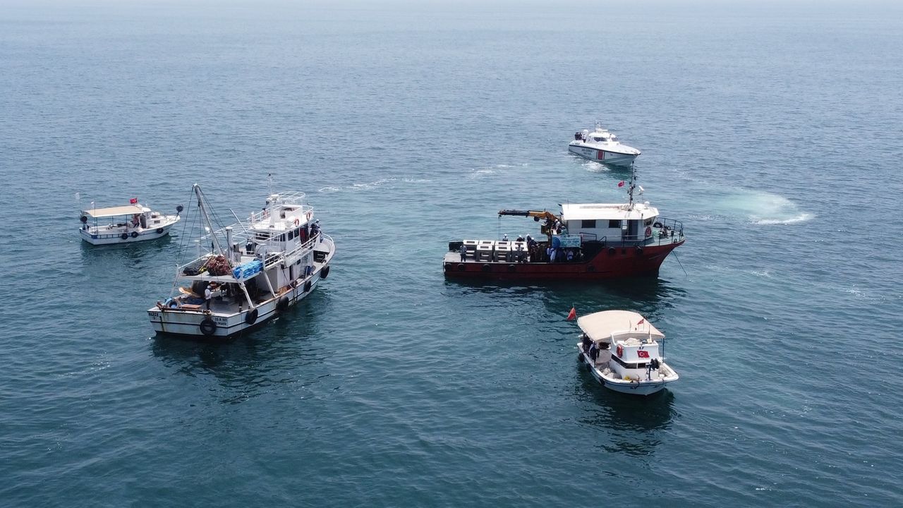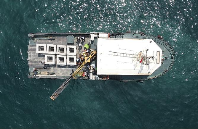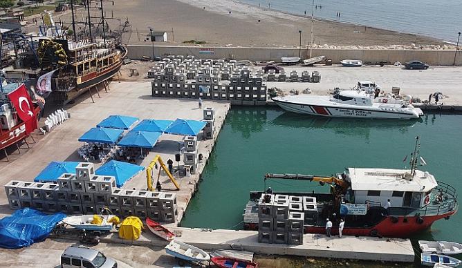 Mersin'de balıkların doğal üretiminin desteklenmesi amacıyla hazırlanan her biri 1,5 tonluk yüzlerce resif, vinçli tekneyle tek tek Akdeniz'e indirilerek yerleştirilmesi yapıldı.