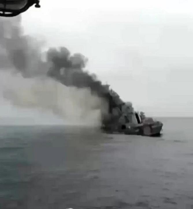 Bununla birlikte, Rus savaş gemisinin yanındaki bir kurtarma gemisinden çekilmiş gibi görünen fotoğraflar, güvertenin altında yanan alevler ile gökyüzüne yükselen kalın bir siyah duman tabakasını ve geminin sol tarafında ağır bir hasar olduğunu gösterdi.