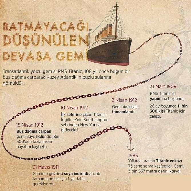 Transatlantik yolcu gemisi RMS Titanic, 108 yıl önce bugün bir buz dağına çarparak Kuzey Atlantik’in buzlu sularına gömüldü.