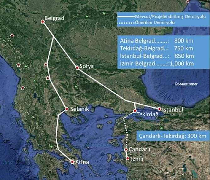 Tekirdağ’dan ve Ambarlı’dan Belgrad seferlerini başlatabiliriz. Hatta halihazırda İzmir-Aliağa arasında olan demiryolunu 300 km’lik ilave bir hat ile Tekirdağ’a bağlayabiliriz.
