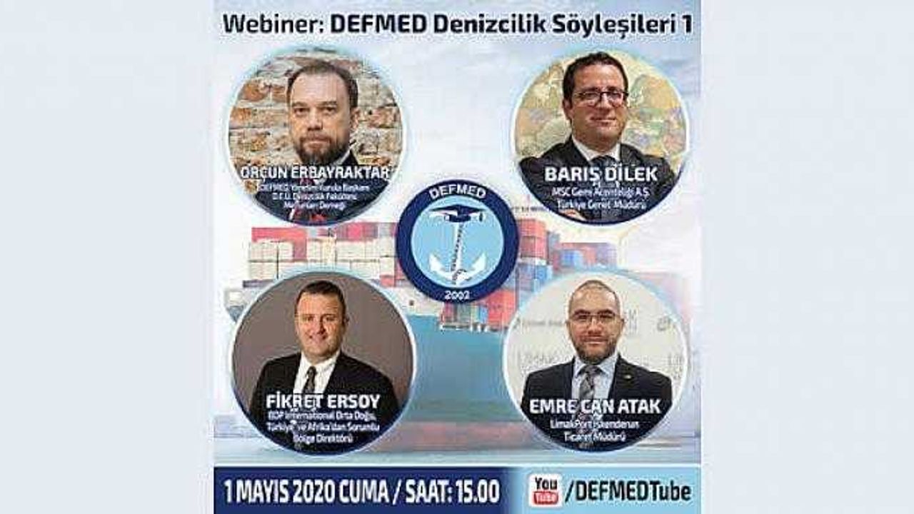 DEFMED Denizcilik Söyleşilerinin birincisi yapıldı. Covid-19 Salgınının Denizcilik Sektörüne Etkileri’ni tartışmak üzere DEFMED Derneği Başkanı Orçun Erbayraktar'ın moderatörlüğünde yürütülen söyleşiye konteyner gemi operatörlüğü, konteyner terminal işletmeciliği ve lojistik hizmet sağlayıcı iş dallarından çok değerli mezunlar; Barış Dilek, Emre Can Atak, ve Fikret Ersoy konuk olarak katıldı.