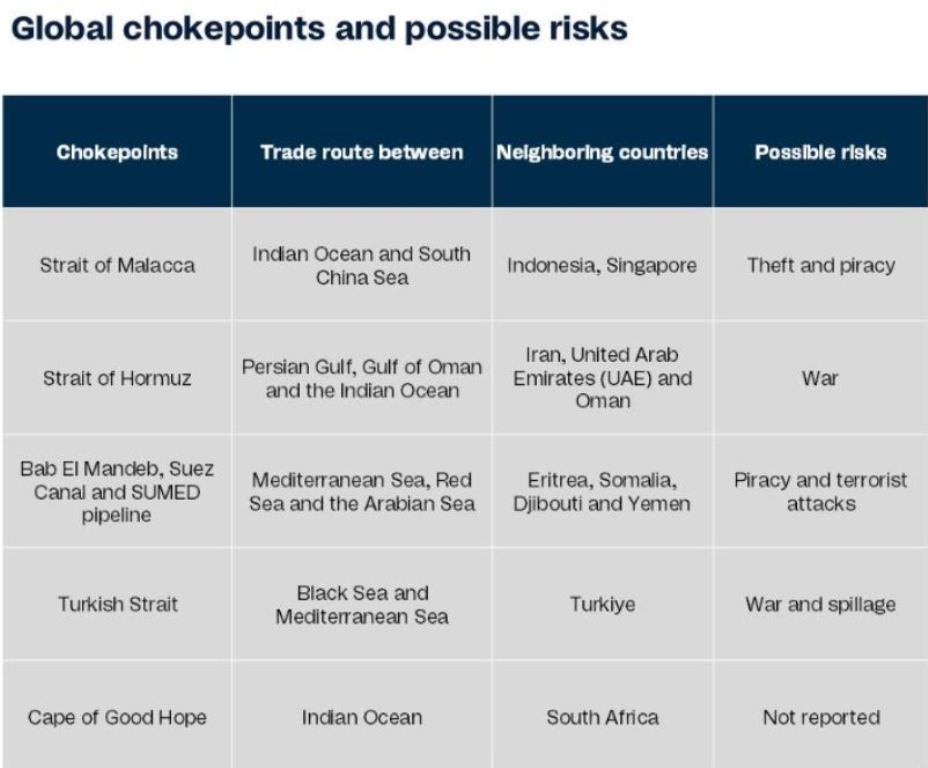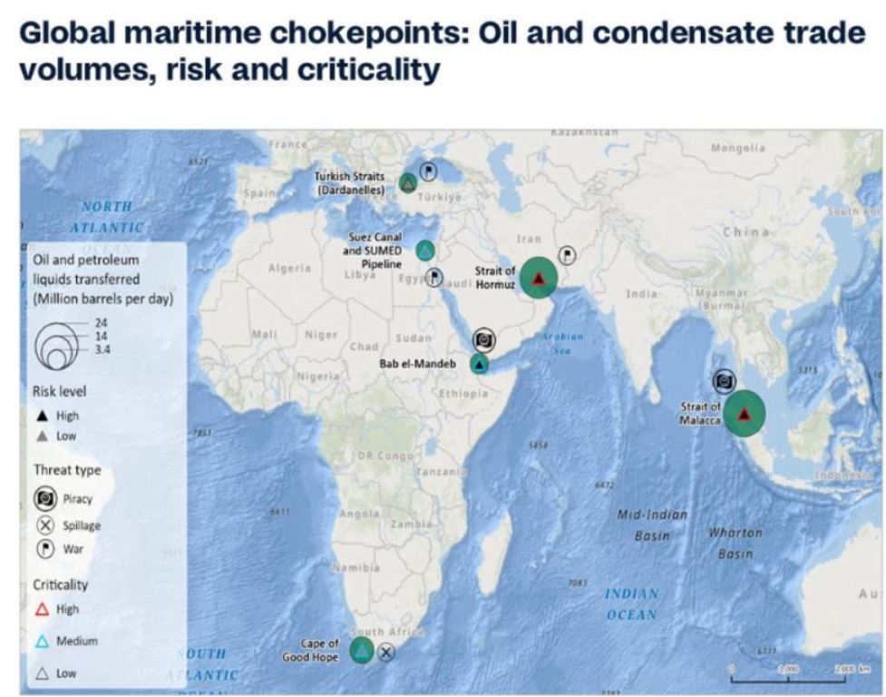 Bu tıkanma noktalarındaki herhangi bir aksaklık, tedarik zincirlerini parçalayabilir, enerji fiyatlarında keskin artışları tetikleyebilir ve dünya çapında ciddi ekonomik hasara yol açabilir.