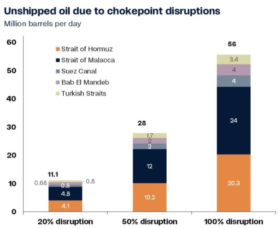 Küresel petrol talebinin yaklaşık dörtte üçü, ulaşım için deniz geçiş noktalarına dayanıyor. Bunun yaklaşık dörtte biri Malakka Boğazı’ndan, beşte biri ise Hürmüz Boğazı’ndan geçiyor.