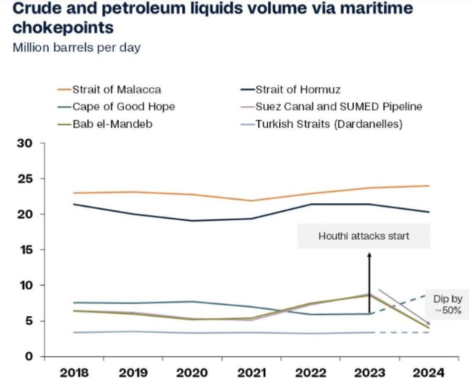 2023’ün sonlarındaki Husi saldırıları, Bab el-Mandeb Boğazı’ndan geçen nakliye hacimlerinin altı ay içinde yaklaşık %50 düşmesine neden olarak küresel deniz yoluyla taşınan petrol ticaretini etkiledi ve trafiği normalin altında tuttu.