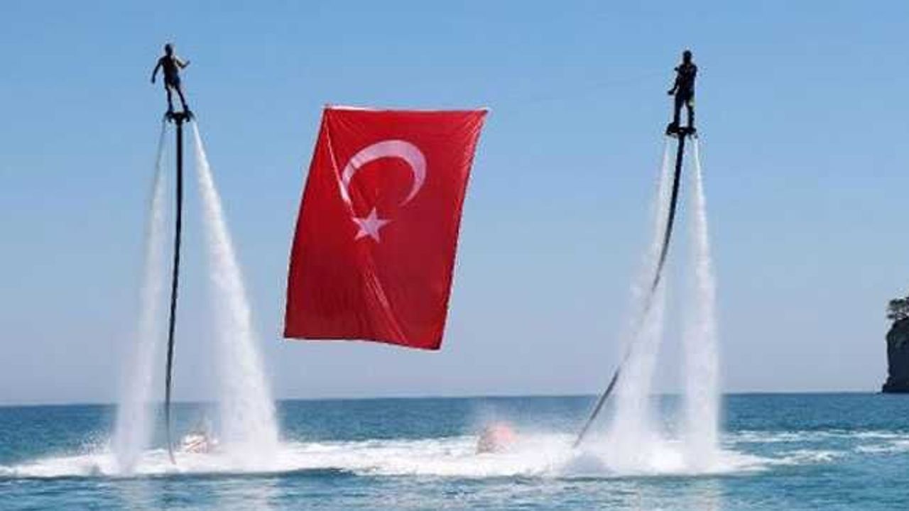 Antalyaʹnın Kemer ilçesinde 23 Nisan Ulusal Egemenlik ve Çocuk Bayramı dolayısıyla flyboard sporcuları denizde Türk bayrağı açtı. Çocuklar da flyboarda binerek eğlendi.