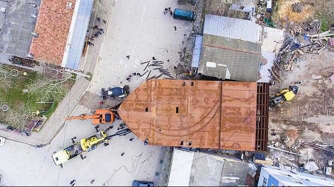 Bursa'nın Karacabey ilçesinde bir atölyede imal edilen 200 tonluk dev balıkçı teknesi karadan yürütülüp sahile taşındı. 1 vinç, 3 kepçe ve 3 traktörün yanı sıra 40 kişilik ekiple yapılan çalışma ile dev tekne, adeta santim santim itilerek balıkçı limanına çekildi. Burada ilave parçaları da monte edildiğinde tekne, 33 metre uzunluğunda ve 16 metre genişliğinde olacak.