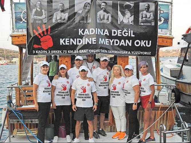 Ege Genç İşadamları Derneği’nin desteği ve Ege Çağdaş Eğitim Vakfı’nın işbirliğiyle, kadına şiddete karşı farkındalık oluşturmak amacıyla düzenlenen ortak proje kapsamında, Seda Kansuk, Memduh Kansuk, Şadi Gödek, Uğur Doğan, Senem Ülker ve Ayşin Oya Bekbay’dan oluşan 6 açık su yüzücüsü, Seferihisar’a kadar sürecek 80 kilometrelik yüzüş etabının startını bu sabah Çeşme sahilinden verdiler.