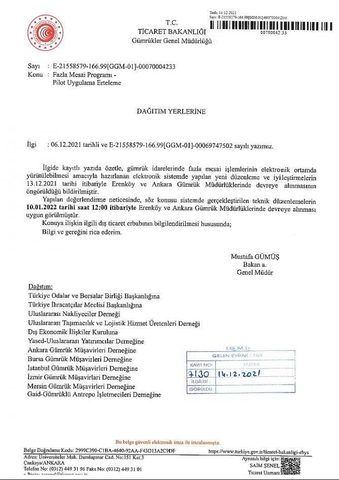 Ticaret Bakanlığı Gümrükler Genel Müdürlüğü, “Fazla Mesai Programı - Pilot Uygulama Erteleme” hakkında bir yazı yayımladı. Buna göre, fazla mesai işlemlerine ilişkin hazırlanan pilot uygulamanın tarihi 13 Aralık 2021’den 10 Ocak 2022’ye ertelendi.