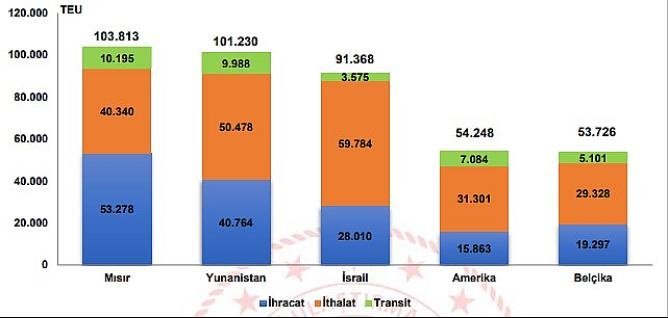 Mısır, 2022 yılı Haziran ayında 103 bin 813 TEU ile en fazla konteyner elleçlemesi yapılan ülke oldu. Mısır’ı sırasıyla 101 bin 230 TEU ile Yunanistan ile yapılan taşımalar ve 91 bin 368 TEU ile İsrail ile yapılan taşımalar takip etti.