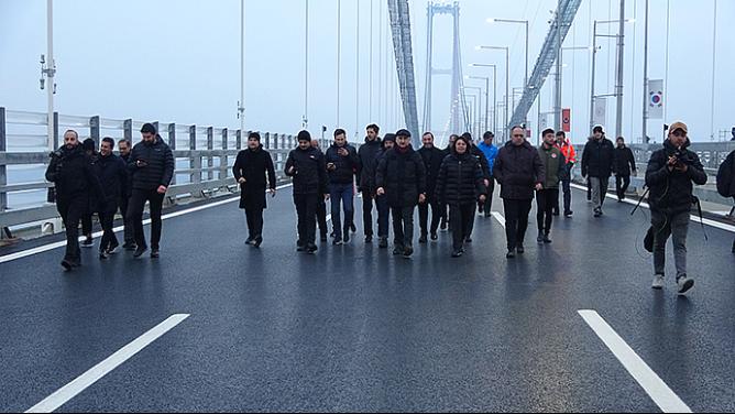 18 Mart Şehitleri Anma Günü ve Çanakkale Deniz Zaferi etkinlikleri kapsamında yarın Cumhurbaşkanı Recep Tayyip Erdoğan’ın da katılacağı törenle açılacak olan 1915 Çanakkale Köprüsü için son hazırlıklar tamamlandı. Ulaştırma ve Altyapı Bakanı Adil Karaismailoğlu, AK Parti Çanakkale Milletvekili Jülide İskenderoğlu, beraberindekiler ve basın mensupları, Gelibolu'daki Sütlüce şantiyesinden 4 bin 608 metre yürüyerek Lapseki’deki Şekerkaya şantiyesine geldi. Burada gün doğumunu izleyen Bakan Karaismailoğlu, beraberindekilerle bol bol hatıra fotoğrafı çektirdi.