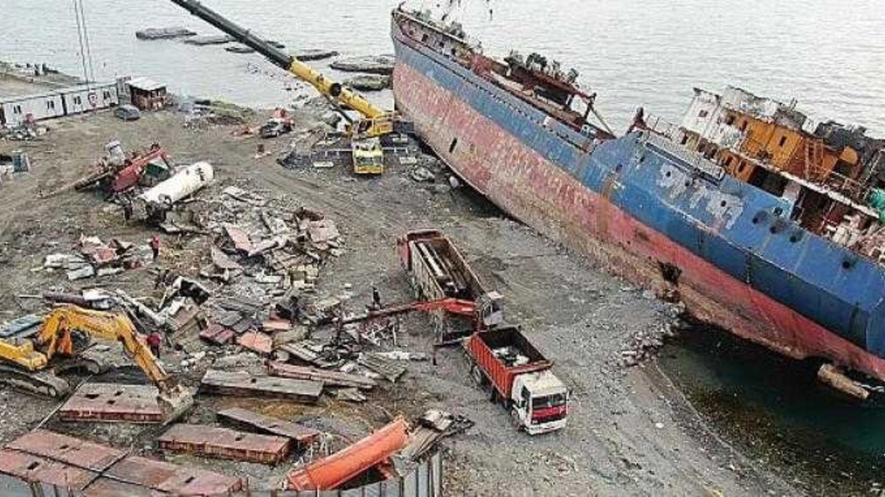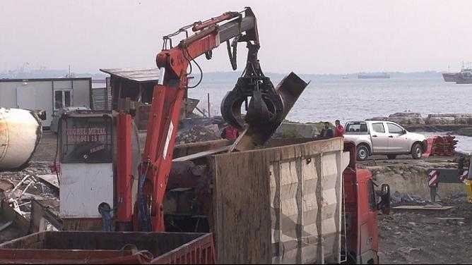 Geminin bulunduğu bölgede şantiye alanı kurulduğu görüldü. Hem geminin güvertesinde hem de şantiye alanında işçilerin ve iş makinelerinin çalışma yaptığı gözlendi. Geminin güverte ve gövdesinden alınan parçalar, iskelede kurulan alanda işçiler tarafından kesiliyor, parçalara ayrılarak işleniyor.