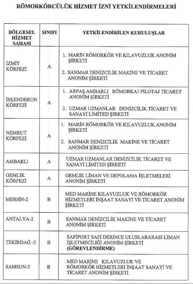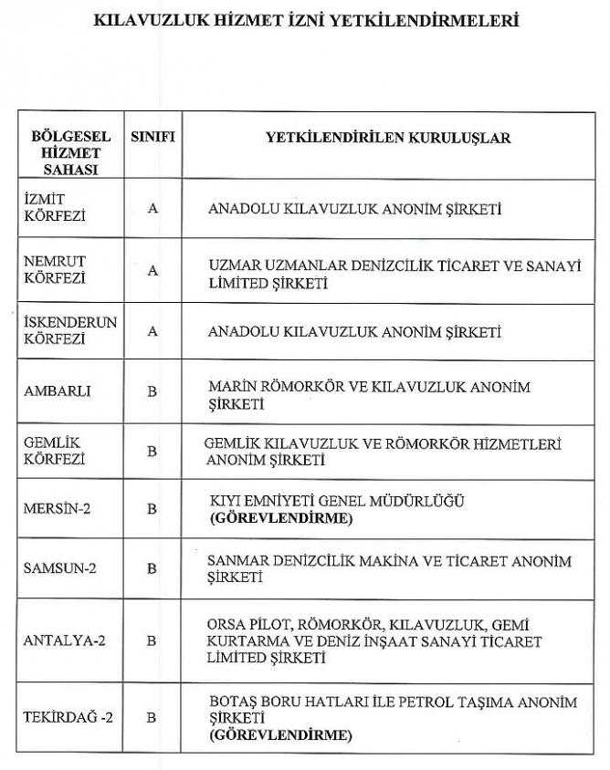 Buna göre A sınıfı kılavuzluk hizmetlerinde İzmit Körfezi’nde Anadolu Kılavuzluk, Nemrut Körfezi’nde Uzmar Uzmanlar Denizcilik, İskenderun Körfezi’nde Anadolu Kılavuzluk, B sınıfı kılavuzluk hizmetlerinde Ambarlı’da Marin Römorkör, Gemlik Körfezi’nde Gemlik Kılavuzluk, Mersin 2’de Kıyı Emniyeti Genel Müdürlüğü, Samsun 2’de Sanmar Denizcilik, Antalya 2’de Orsa, Tekirdağ 2’de BOTAŞ hizmet verecek.