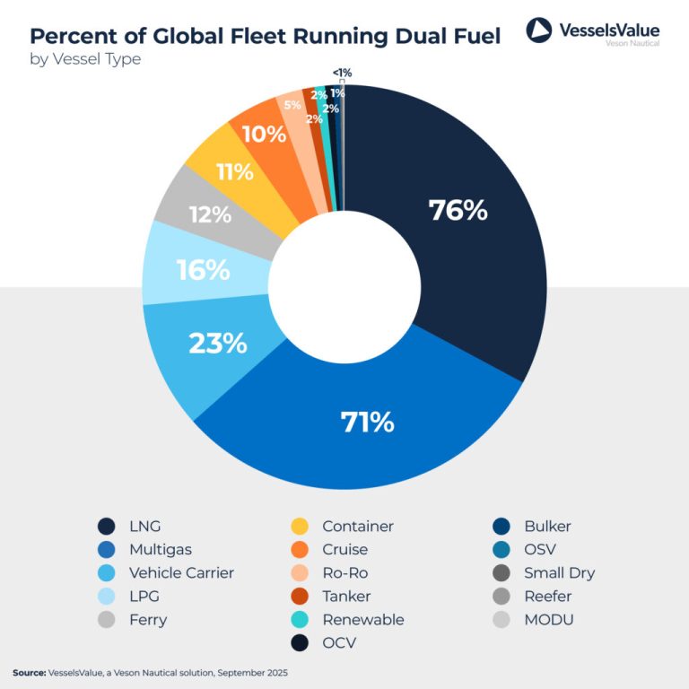 Multigas %71 ile ikinci sırada yer alırken, onu %23 payla Araç Taşıyıcılar izliyor. Küresel sipariş defterinde, Araç Taşıyıcıların çoğu çift yakıtlı. Bu eğilim, bu gemilerle taşınan birincil kargo tarafından yönlendiriliyor: EV'ler (Elektrikli Araçlar) dahil olmak üzere fabrika yeni OEM (Orijinal Ekipman Üreticisi) hafif araçlar. OEM'ler, yeni hafif ve ağır araçlarını daha düşük emisyon değerleri sağlayan temiz gemilerle taşımayı tercih ediyor. Bu tercih, çevreye duyarlı nakliye çözümlerine olan talebin artmasına neden oldu. Sonuç olarak, Araç Taşıyıcı sektöründe faaliyet gösteren gemi sahipleri, diğer denizcilik sektörlerine kıyasla çok daha yüksek oranlarda çift yakıtlı gemiler sipariş ediyor.