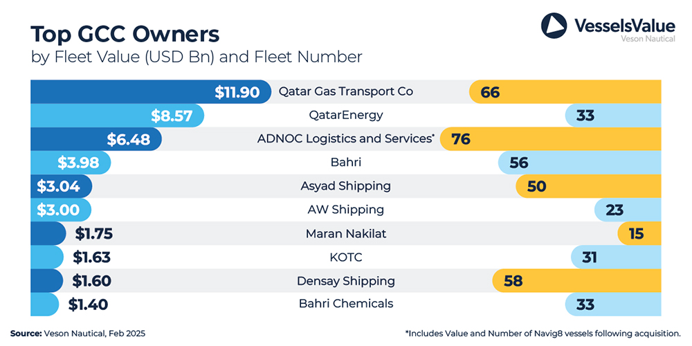 VesselsValue verilerini kullanan Veson Nautical, Körfez İşbirliği Konseyi (KİK) bünyesindeki ülkelerin sahip olduğu filoyu gündemine alarak 2024 yılında en çok yeni gemi inşa edecek 10 alıcıya, sipariş edilen en popüler gemi tiplerine ve bölgedeki en önde gelen gemi sahiplerine dikkati çekiyor.