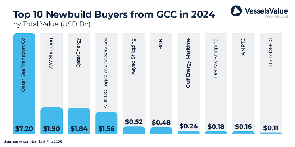 Geçen yıl en çok gemi siparişi veren KİK şirketleri arasında, Qatar Gas Transport Co. 7,2 milyar ABD doları tutarında 30 gemi siparişi vererek yeni inşa sektöründe en büyük harcamayı yapan şirket oldu. Bu siparişlerin %57'sini oluşturan 174.000 CBM'lik Büyük LNG gemilerini, %30'luk payla 271.000 CBM'lik QMAX LNG gemileri takip etti. Son olarak, 88.000 CBM'lik VLGC LPG siparişleri yaklaşık %13'lük bir paya sahip oldu.