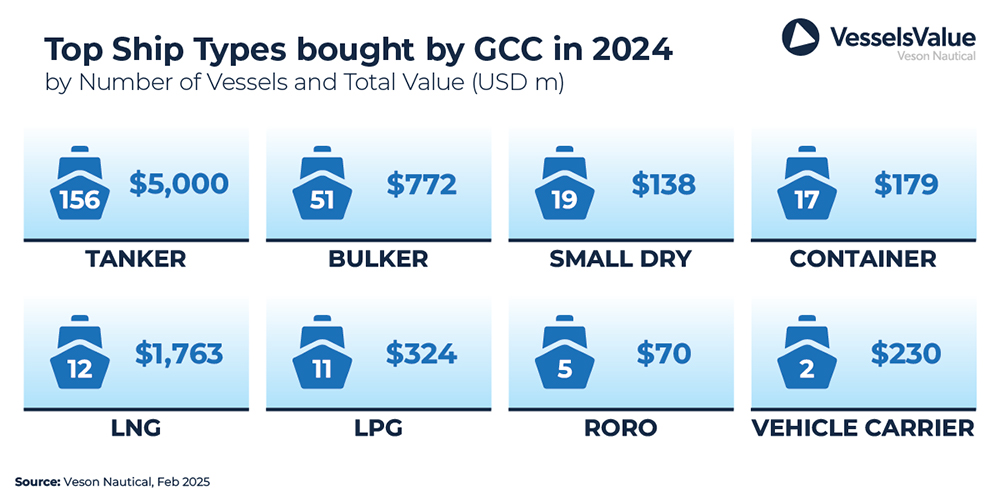 Kızıldeniz krizinin yol açtığı arz-talep dengesizliği piyasa duyarlılığını ve yüksek kazanç beklentilerini körüklediğinden, 2024 yılında KİK bölgesinde satın alınan en popüler gemi, 5 milyar ABD doları değerinde 156 işlemle tankerler oldu. Bu durum sektörün değerlerini güçlü tutarken, yıl boyunca ikinci el piyasası da oldukça hareketli geçti ve bu durum yeni gemi siparişlerini de artırdı.