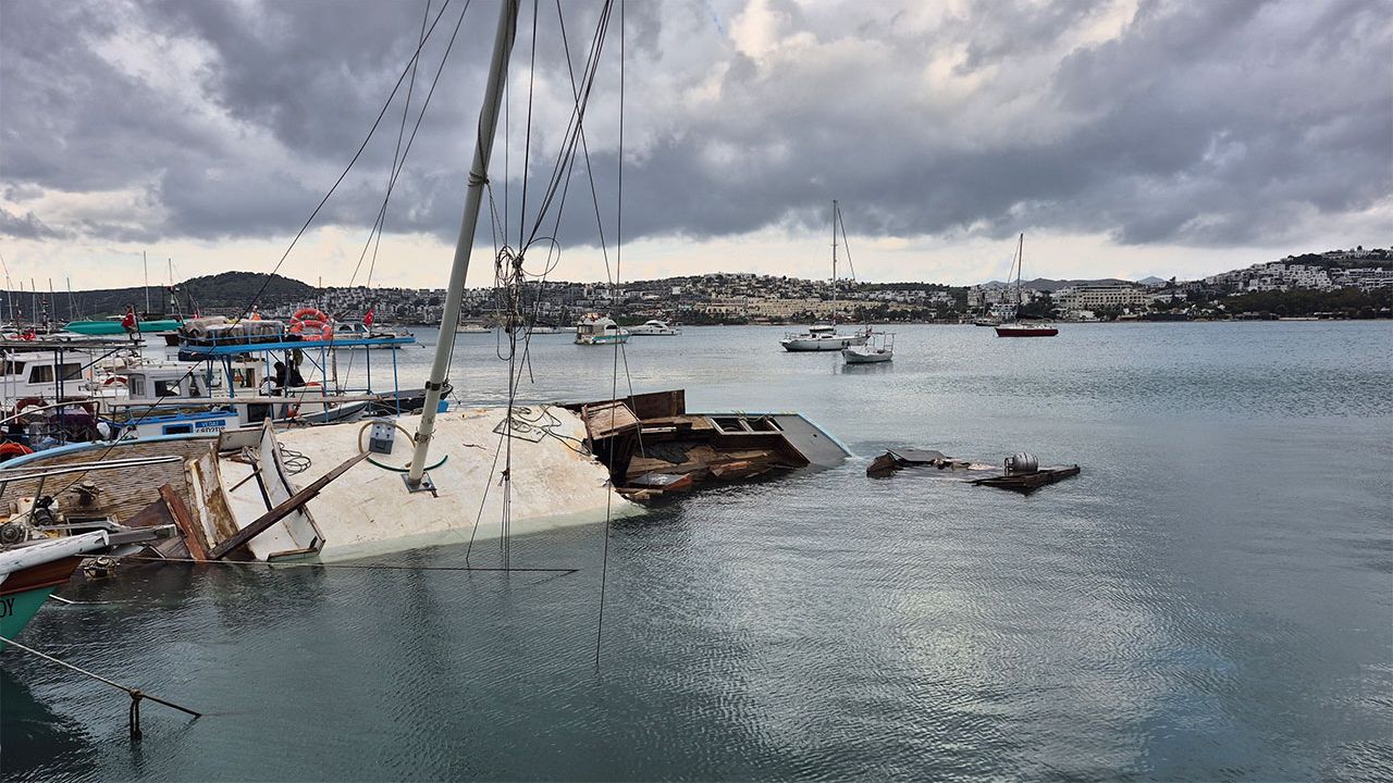 İlçede etkili olan kuvvetli rüzgar günlük yaşamı olumsuz etkiledi. Gümbet Koyu'nda bağlı haldeki 13 metre boyundaki yelkenli tur teknesi, dalgaların etkisiyle su aldı. Yarı batık haldeki teknenin bazı parçalarının da kırıldığı ve denize düştüğü görüldü. Tahta parçalarının üzerindeki bir tüp de göze çarptı. Ağır hasar alan ve ön kısmı yanındaki tekneye dayanan yelkenli kurtarılmayı bekliyor.