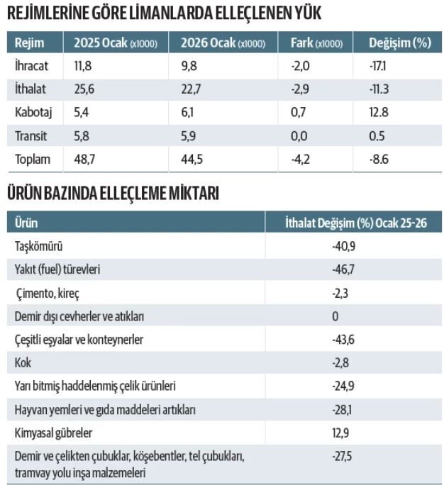 Ocak ayında toplam yük elleçlemesi geçen yılın aynı dönemine göre yüzde 8,6 gerileyerek 48,6 milyon tondan 44,4 milyon tona düştü. Tonaj kaybı 4 milyon tonu aştı. İhracatta yüzde 17,1 gerileme yaşanırken ithalattaki kayıp yüzde 11,3’e çıktı. Bu dönemde konteyner hacmi ise yıllık yüzde 6,6 daraldı.