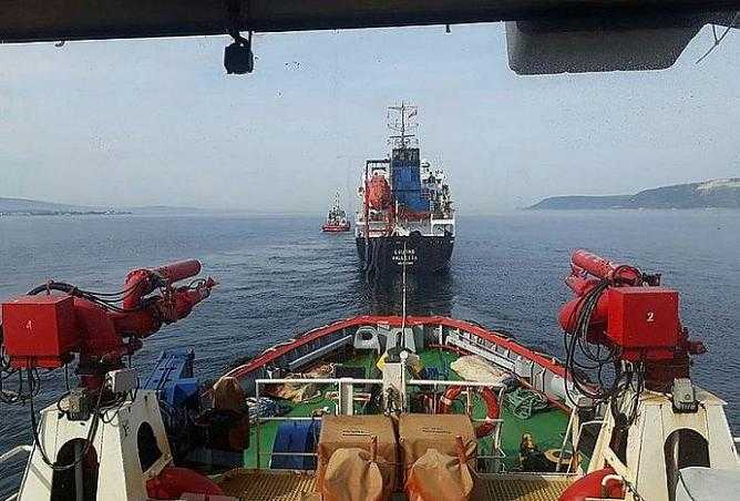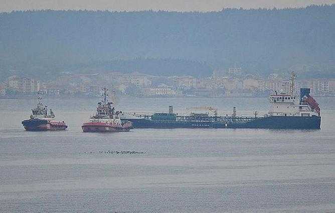 Ege Denizi'ne doğru ilerleyen 'Loutro' isimli tanker, 'Türkeli' römorkörü tarafından halat yardımıyla çekilerek Karanlık Liman'a demirletildi.
