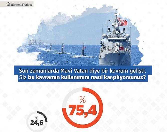 Son dönemlerde sıkça zikredilen “Mavi Vatan” kavramı, Eylül ayı Sosyometre Araştırması’nın ana gündem maddelerinden biri oldu. Araştırmada katılımcılara, “Siz bu kavramın kullanımını nasıl karşılıyorsunuz?” şeklinde sorulan soruya, yüzde 24,6 “Yanlış buluyorum” derken, yüzde 75,4 ise “Doğru buluyorum” dedi.