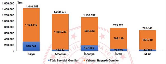 2022 yılı Mayıs ayında denizyolu ile yapılan ihracatta en fazla yük elleçlemesi 1 milyon 440 bin 156 ton ile İtalya’ya yapılan taşımalarda gerçekleşti. İtalya’yı sırasıyla 1 milyon 250 bin 675 ton ile Amerika’ya ve 1 milyon 136 bin 332 ton ile İspanya’ya yapılan taşımalar takip etti. İtalya’ya giden yüklerin 316 bin 744 tonu (yüzde 22’si) Türk bayraklı gemilerle, 1 milyon 123 bin 412 tonu ise (yüzde 78’i) yabancı bayraklı gemilerle taşındı.