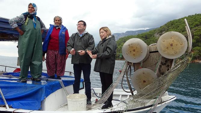 Akyaka iskelesinde teknede başlayan Dünya Balıkçılık Günü etkinliği, denizde devam etti. Teknelerle katılımcılar denize açılırken, denizde önce kadın balıkçılar ile ağ çekildi. Kadın balıkçıların sabah saatlerinde açıldıkları denizde bıraktıkları ağlar Tarım ve Orman İl Müdürü Barış Saylak ile Milletvekili Yelda Erol Gökcan tarafından tekneye çekildi.