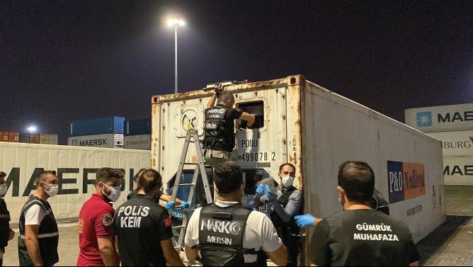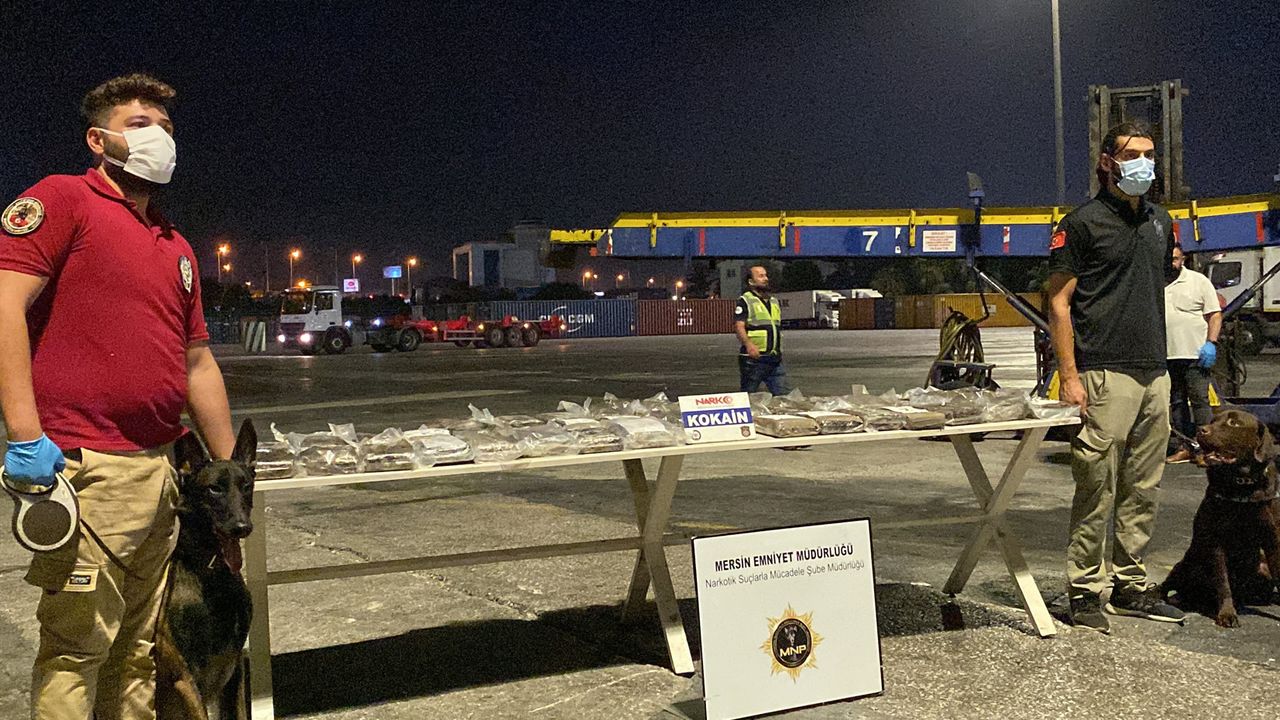 İl Emniyet Müdürlüğünden yapılan açıklamaya göre, Ekvator’dan Hong Kong bandıralı gemiyle Mersin Limanı’na getirilen muz yüklü konteynerlerin içinde uyuşturucu madde olduğu bilgisine ulaşan Narkotik Suçlarla Mücadele Şube Müdürlüğü ekipleri, konuyla ilgili çalışma başlattı. Elde edilen bilgiler doğrultusunda liman sahasındaki muz yüklü konteynerlerde 'Miror' ve 'Brego' adlı narkotik köpekleri vasıtasıyla yapılan aramada, konteynerin birinde havalandırma boşluğuna zulalanmış 40 paket halinde 48 kilo 800 gram kokain ele geçirildi.