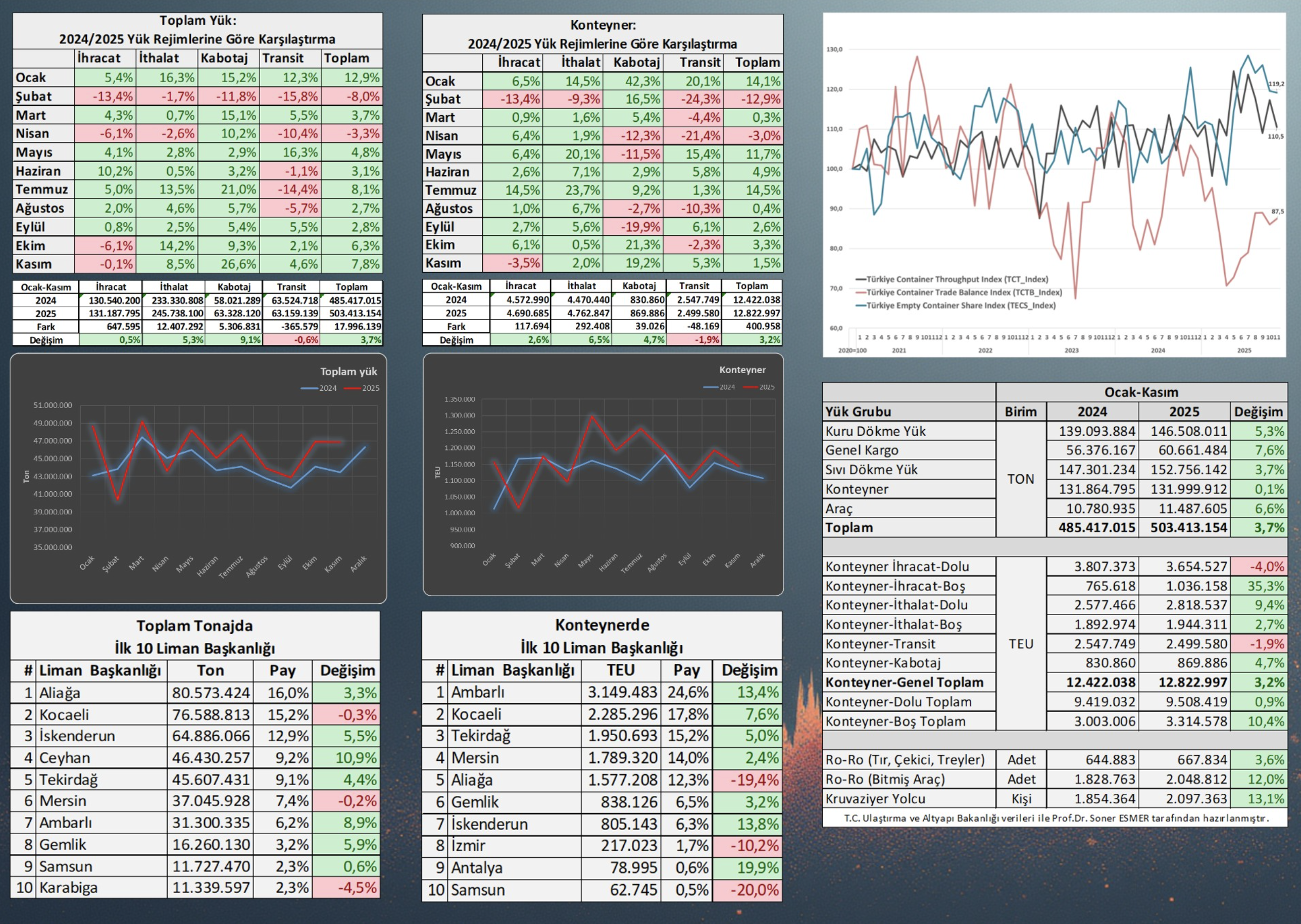 "Toplam yükte artış %3,7 olarak gerçekleşti ve 500 milyon ton sınırı aşıldı. Bu eğilim yılın 550 milyon tona yakın bir noktada tamamlanabileceğine işaret ediyor. En yüksek artış oranı genel yüklerde (%7,6) ve kuru dökme yüklerde (%5,3) görüldü. Özellikle bitmiş araç taşımalarında da güçlü artış sürüyor (%12).