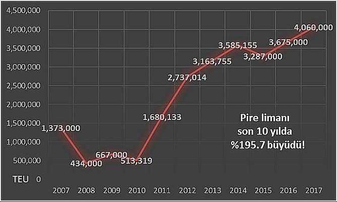 Çin, Bir Kuşak Bir Yol (One Belt One Road-OBOR) projesini ilan etmeden 4 yıl önce (!), yani 2009 yılında bir kamu iştiraki olan COSCO aracılığı ile milyarlarca dolarlık yatırım şartıyla Pire’nin bir terminalinin önce işletmesini devraldı, sonra 2016 yılında limanın yüzde 51 hissesine sahip oldu. Bugün Pire limanı son 10 yılda yüzde 195.7 büyüyerek 4 milyon TEU’yu geçti ve dünyanın en hızlı büyüyen limanı oldu.