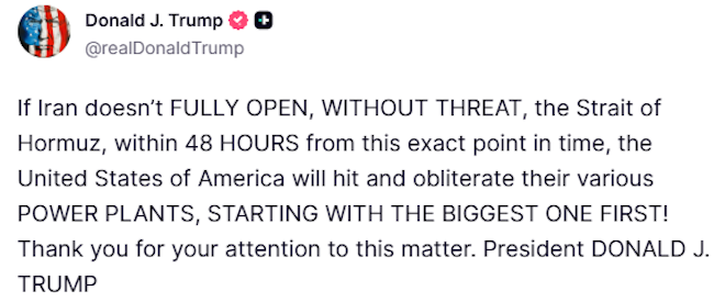 ABD Başkanı Donald Trump, İran’a Hürmüz Boğazı ile ilgili çok sert bir uyarıda bulundu. Trump, sosyal medya hesabından yaptığı açıklamada, İran’ın Hürmüz Boğazı’nı 48 saat içinde tamamen açmaması halinde, ülkenin enerji santrallerini hedef alacaklarını duyurdu. Trump, "Eğer İran, şu andan itibaren 48 saat içinde, herhangi bir tehdit olmaksızın, Hürmüz Boğazı'nı tamamen açmazsa, ABD en büyüğünden başlayarak İran’ın çeşitli enerji santrallerini vurup yok edecek" dedi.