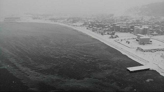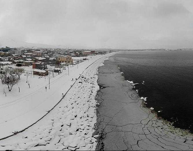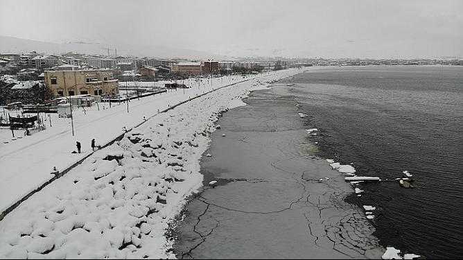 Bitlis’te kar yağışının durmasının ardından başlayan şiddetli soğuklar, Türkiye’nin en büyük sodalı gölü olan Van Gölü kıyılarının buz tutmasına yol açtı. Van-Tatvan arasında 3 bin 755 kilometrekare alana sahip gölün kıyıları, hava sıcaklığının gece sıfırın altında 15 dereceye kadar düşmesiyle buzla kaplandı. Göl kıyısındaki buz tabakasının üzerine yağan ince kar da bembeyaz görüntüsüyle seyrine doyumsuz görüntüler oluşturdu. Göl kıyılarında görenleri hayran bırakan manzara, havadan drone ile görüntülendi.